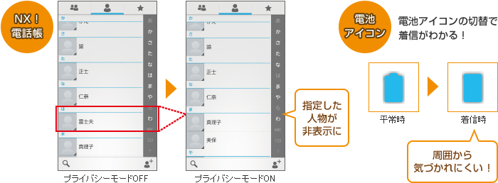 指定した人物に関する電話帳、発着信履歴をはじめ、ギャラリー、ブラウザなどの個人情報を非表示にできるセキュリティ機能。スマート指紋センサーを長押しするだけで、起動・解除が可能です。さらに、指定した人物からの着信を、電池アイコンの切替によってこっそり通知するステルス機能も搭載しています。