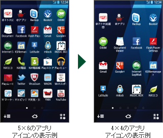 アプリアイコンの表示(横×縦)をカスタマイズ。4×4、4×5、4×6、5×6から表示個数を選べます。