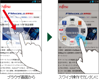 ホームに戻ることなく、画面の端から画面の中央へ指を動かすスワイプ操作で、よく使うアプリをすぐに起動可能。任意の8個のアプリを設定できます。