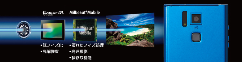 裏面照射型CMOSセンサー「Exmor R(エクスモア アール) for mobile」、高感度、低ノイズ化と多彩な撮影機能を実現する画像処理エンジン「Milbeaut(ミルビュー)Mobile」を採用。一眼レフ並みに美しく、高精細な写真や動画が撮影できます。