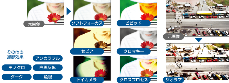 クロマキーやセピア、ジオラマなど、特殊なフィルター機能を全12種類搭載。思わず自慢したくなる、こだわりの写真や動画が撮影できます。