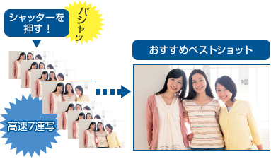 シャッターを1回押すと7枚の写真を高速連写し、ベストな1枚を自動的にセレクト。撮影の際にまばたきしたり、顔がブレたりしても安心です。
