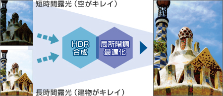 露光時間(シャッタースピード)の違う2枚の写真を同時に撮影・合成し、実際に目で見る鮮明で美しい写真をそのまま記録できます。