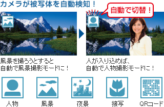 人物や風景、夜景、接写など、撮影シーンをカメラが自動で判別し、最適なモードで撮影できます。さらにQRコードの自動認識にも対応しているので、Webサイトなどへのアクセスもカンタンです。