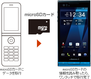 今まで使っていたケータイに蓄積された情報を、microSDカードを経由して一括でカンタンに引き継ぎできます。ケータイからのデータ移行もスムーズです。