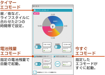 省電力を実現する機能が充実。手動でもエコモードを起動できるので、気づいた時に設定し、節電することが可能です。