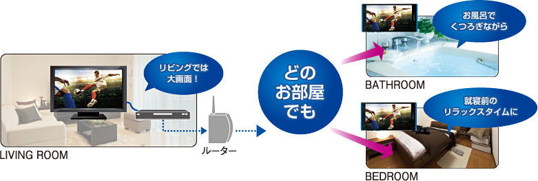 ブルーレイディスクレコーダーとの接続で、現在放送中の番組も視聴可能。高画質な番組を、家中どこでも楽しめます。