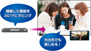 ブルーレイディスクレコーダーで録画した番組をワイヤレスで201Fにダビングして外出先でも視聴可能。通勤や待ち時間にもハイビジョン映像が楽しめます。