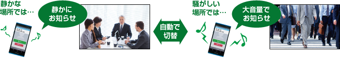 歩行・走行状態や周囲の環境を自動で検知。静かな場所では着信音量を小さく、歩行中や騒がしい場所では大きくしてお知らせします。
