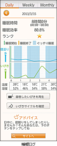 加速度センサーとマイク(音響センサー)を使い睡眠状態を検知。就寝時間や起床時間はもちろん、睡眠時間、寝返りの多さ、いびきの音の大きさ、いびきの間の途切れなどの詳細な睡眠情報が一目瞭然に。毎日の睡眠状態からより良い眠りのためのアドバイスメッセージを提供します。