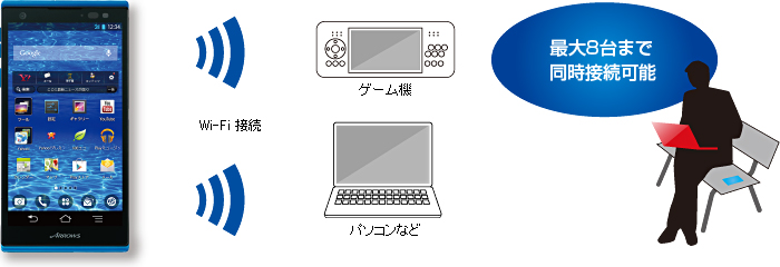 201Fをアクセスポイント(親機)として使えば、外出先でもポータブルゲーム機やパソコンなどのWi-Fi機器(子機)を最大8台までネットに接続できます。