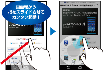 画面の端から画面の中央へ指を動かすだけで、表示している画面が保存され、さらにそのまま手書き入力が可能です。地図上に道順を書いたり、注目してほしい箇所にマーカーを引いたりと、多彩な使い方が楽しめます。書いたメモはSNSなどへワンタッチで共有できるので便利です。