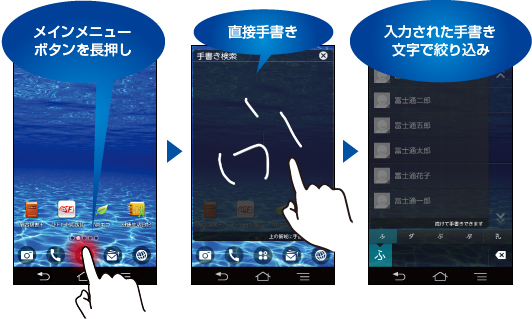 わざわざ電話帳を開かずに、画面上で直接手書きをして、電話をかけたい相手の名前をカンタンに呼び出すことができます。アプリや辞書などを含めて検索候補に表示させることも可能です。