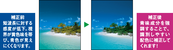 年齢に合わせた自動配色補正機能。色の彩度に対する感度は年齢によって異なり、加齢とともに青の色覚特性が変化します。ユーザーの年齢に合わせて青味を調節し、識別しやすい配色を実現します。