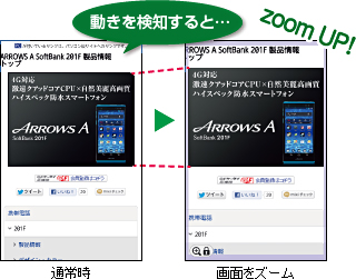 動いていることを自動で検知し、メールやWebブラウザの閲覧時に文字の大きさを読みやすいサイズに自動で変換します。