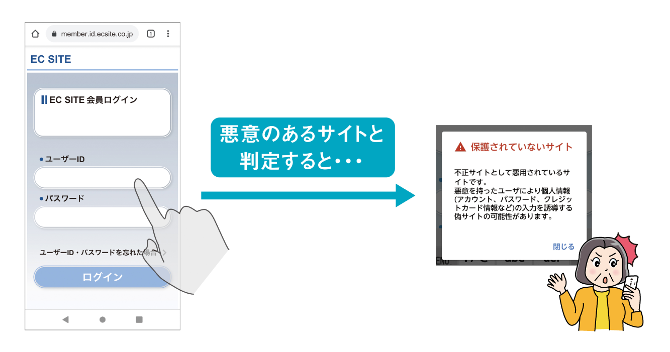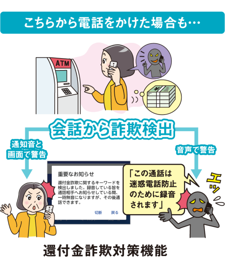 あやしいサイトから身を守る「フィッシング詐欺警告機能」は、偽サイトに誘導された場合にサイト判定を行い注意喚起を表示。また、電話帳未登録の連絡先から着信があると、事前に教えてくれる「迷惑電話対策機能」や、通話音声を解析し、けん制と注意喚起をする「還付金詐欺対策機能」であんしん。