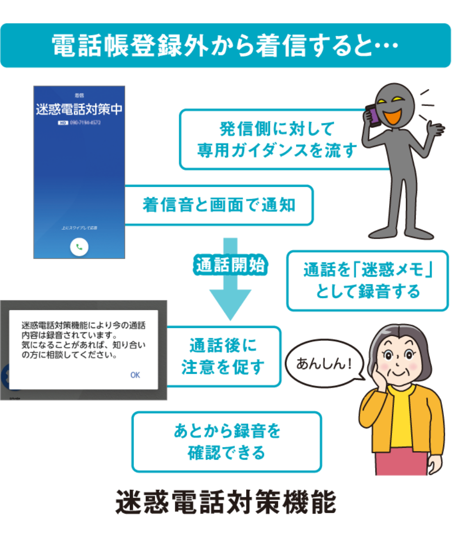 - ※6 あらかじめ設定が必要です。注意喚起を行うのみであり、あらゆる詐欺や迷惑電話を未然に防ぐことを保証するものではございません。注意喚起された場合は、周りの人や近くの警察にご相談をお勧めします。