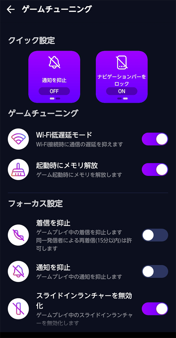 ゲームアプリをまとめて表示できるランチャー機能や、ゲームプレイ中の通知抑止など細かい設定が出来るチューニング機能でゲームを快適に楽しくプレイすることが出来ます。