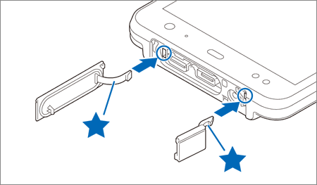 外部接続端子カバー、ステレオイヤホン端子カバーは、容易には外れない構造になっていますが、強く引っ張るなどの過度の力が加わった場合は破損を防止するため外れる仕組みとなっています。万一、外部接続端子カバー、ステレオイヤホン端子カバーが外れたときは、図の向きで、★の部分を押しながら挿入してください。
