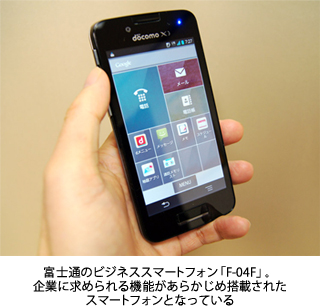 このように、企業でスマートフォンを導入する際には、解決しなければならない課題がいくつかあるが、ついにこれらの課題の解決に真剣に取り組んだスマートフォンが登場してきた。NTTドコモから新たに登場したのが富士通製のビジネススマートフォン「F-04F」だ。