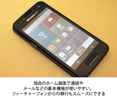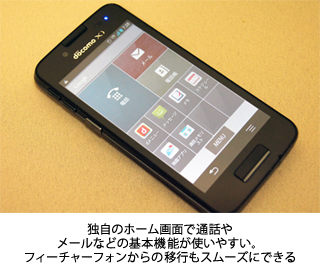 まず、「ビジネスに最適な操作性の実現」から見ていこう。F-04Fでは、ビジネスシーンでよく使う操作に特化したホームアプリが採用されている。電話、メール、電話帳など、よく使うアイコンが大きく表示されており、とてもわかりやすい。デザインもフィーチャーフォンに近いイメージで構成されており、フィーチャーフォンから移行しても違和感なく使えるようになっている。