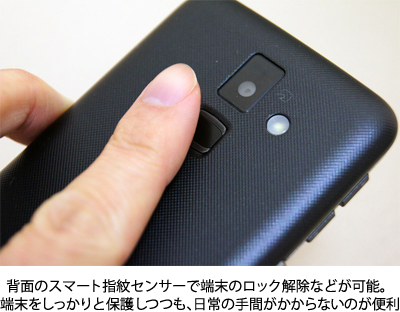 続いて、「安心して使えるセキュリティ機能」について見ていこう。F-04Fには背面にスマート指紋センサーが搭載されており、あらかじめ指紋を登録しておくことで、指をなぞるだけでロック画面を解除したり、指定したアプリの起動時に指紋認証を求めることができるようになっている。