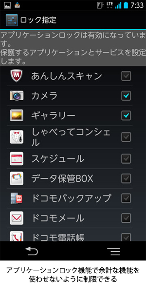 このほか、「SECURITY for Biz」や「ビジネスmoperaあんしんマネージャー」などのNTTドコモのサービスにも対応しており、スマートフォンの遠隔ロックや初期化、カメラ機能のオフといった自社に合わせたカスタマイズも可能だ。