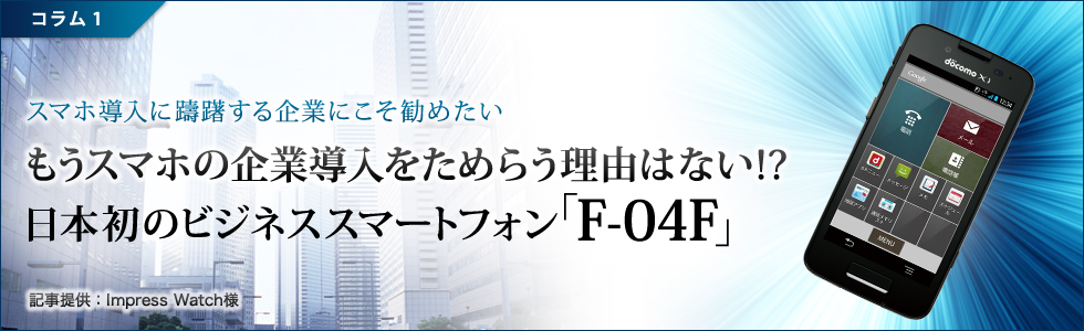 しかし、F-04Fであれば、標準機能+αのサービスを活用するだけで、セキュアかつ手軽に、業務にスマートフォンを活用することが可能というわけだ。これまでスマートフォンの導入に二の足を踏んでいた企業でも、F-04Fなら、業務効率化やワークスタイルの変革に、きっとスマートフォンを活用できるだろう。