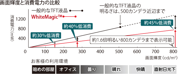 直射日光の下でも明るく見やすい画面で表示でき、しかも一般的なTFT液晶と比べて最大約45%の消費電力を削減します。外回りの多いビジネスシーンでも快適に利用できる、省電力ディスプレイです。