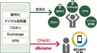 暗号化、VPNなど、5つの機能をドコモが技術情報を公開して正式にサポートします。従来、スマートフォンの導入時の検証にかかっていた手間を大幅に削減することが可能です。