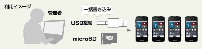 「撮影禁止現場での業務にはカメラ機能OFF」「機密性の高い業務にはSDカードの利用抑止」など、ビジネスニーズに合わせた機能カスタマイズを複数台まとめて行うことができます。導入部門・管理部門の手間を軽減できるうえ、手作業による設定ミスもなくなるので便利です。