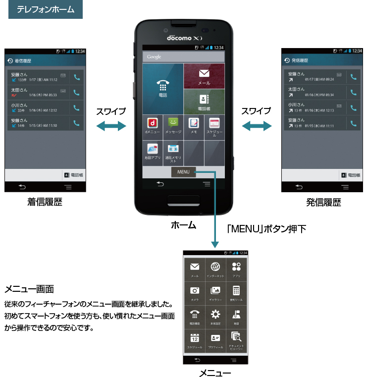 ビジネスで頻繁に利用する電話の使いやすさに特化した専用ホーム画面「テレフォンホーム」を採用しました。左右のスワイプで電話の発着信履歴を表示し、その画面から発信できるので、電話をかけ直すことが多いビジネス利用に最適です。また、電話やメールのアイコンを大きく配置し、直感的に操作できる画面設計なので、安心してスマートフォンに乗り換えていただけます。