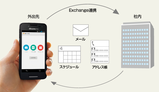 Microsoft® Exchange ActiveSync®により、スマートフォンとExchangeサーバの間でデータを自動同期。スマートフォン内の同期データはアプリの独自領域に格納するので情報漏えいを防げます。