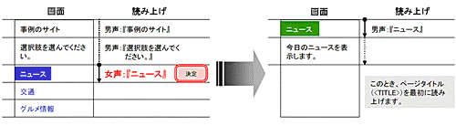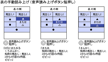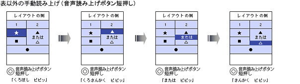 いずれも、フォーカスのある部分を読み上げると、操作待ち状態になります。- ユーザは「自動読み上げ」と「手動読み上げ」のいずれかを選択することが可能です。