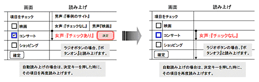 - 自動読み上げの場合は、決定キーを押した時に、その項目を再度読み上げます。