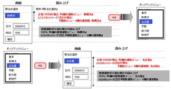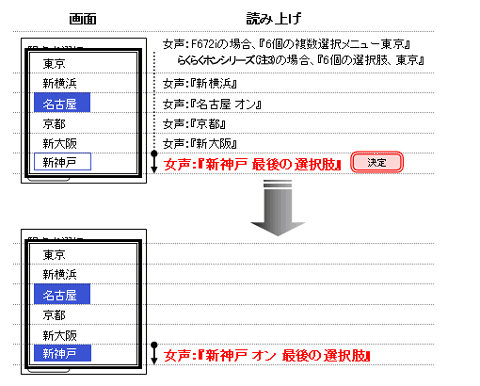 注5:ポップアップメニュー(<SELECT>)の選択肢(<OPTION>)が、1つしかない場合は、F672iでは、『×個の複数選択メニュー』および『最後の選択肢』を読み上げません。