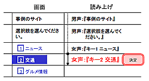 - 決定キーを押下できるセクションは、自動的に声質を変更して読み上げます(例えばリンクのあるテキストは女性の声で読み上げ、通常のテキストは男性の声で読み上げます)。