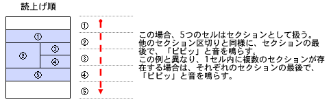 - セクションへ入った時点で「○行にまたがる」「×列にまたがる」を補足して読み上げます。