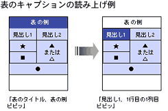 - 「表のタイトル」を補足して読み上げます。「表のタイトル」を読み上げた後、入力されている文字列を読み上げます。