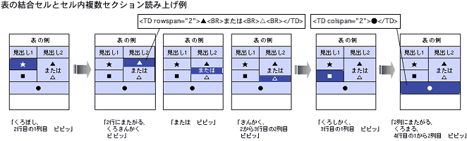 - <th><td>のcolspan属性、rowspan属性について、以下のように読み上げます。