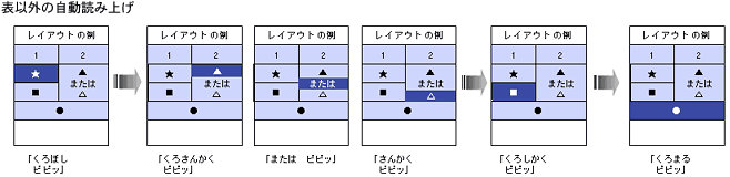 - テーブル内のセルは、基本的に「左→右」の順で読み上げ、その後、次の行を同様に「左→右」で読み上げます。