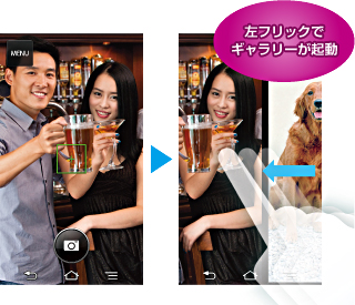 撮影中に、ファインダー画面上で左フリックをすると、ギャラリーが起動。撮影した写真をすぐにチェックできます。