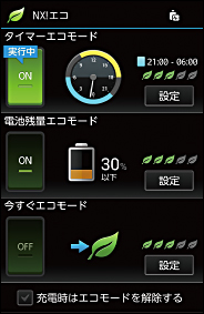 バッテリーの消費に関する機能について、まとめて省エネ設定ができる「NX!エコ」。わかりやすい3つのモードでカンタンにバッテリー節約が可能です。