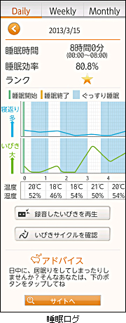 加速度センサーとマイク(音響センサー)を使い睡眠状態を検知。就寝時間や起床時間はもちろん、睡眠時間、寝返りの多さ、いびきの音の大きさ、いびきの間の途切れなどの詳細な睡眠情報が一目瞭然に。毎日の睡眠状態からより良い眠りのためのアドバイスメッセージを提供します。