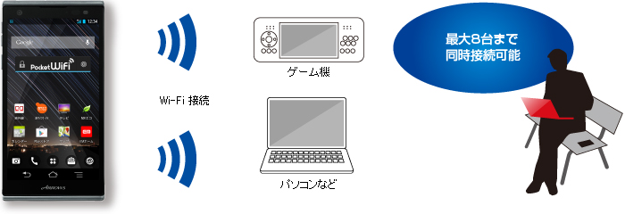 EM01Fをアクセスポイント(親機)として使えば、外出先でもポータブルゲーム機やパソコンなどのWi-Fi機器(子機)を最大8台までネットに接続できます。