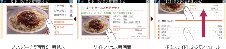 指のスライドに合わせて、画面をスクロールできることはもちろん、サイト上のタッチしにくい小さなリンクなどは、ダブルタッチすることで一時拡大してから選択することも可能。使いやすさにこだわりました。