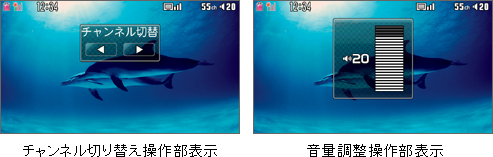 ビューアスタイルでのワンセグ視聴中は、タッチパネルにより、左右スライドでチャンネル切り替え、上下スライドで音量調整の操作部が表示されるので、わかりやすく、直感的な操作でチャンネル/音量の変更ができます。