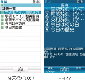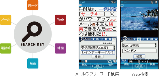 F-01Aでは、メールのフリーワード検索を追加。メール内容の一部を入れるだけで、読みたいメールを探せます。また、検索ジャンルは、ネット検索とデータ検索の2種類。ネット検索では「iモード」「Web」「地図」の検索が行え、データ検索では「電話帳」「メール」「辞典」の検索が行えます。