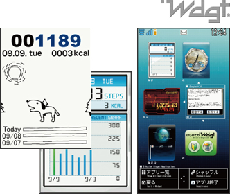 iウィジェットとは、電卓や時計、株価情報など頻繁に利用するコンテンツ(ウィジェットアプリ)にiウィジェットボタン()1つでアクセスできる便利な機能です。F-01Aでは、F906iで好評のウォーキングチェッカーをウィジェット化し、歩数に応じて変化するアニメーションが楽しめるようになりました。