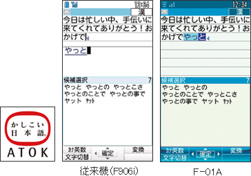 F-01Aでは、インライン入力を採用したことにより、メール本文の作成中でも、そのまま入力していくことができるようになりました。また、快適な文字入力をサポートするATOK®を採用。ひとつのボタンでカナ・英・数を切り替えられたり、同音語を変換し分けたりと便利です。
